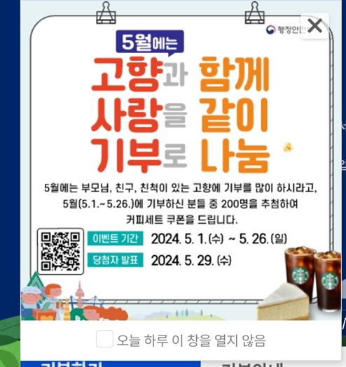 고향사랑e음은 작년 고향이나 후원하고 싶은 자자체에 기부하면 세액공제와 더불어 답례품도 받을 수 있어 시민들의 많은 사랑을 받은 행사였습니다. 그러나 처음 시행되는 행사이다 보니 이 쉬운 점이 보였으나 2024년 고향사랑e음은 더 개선되고 다양해진 이벤트를 가진 행사로 시민들의 참여를 기다리고 있습니다. 그럼 고향사랑e음은 어떤 행사인지 2024년의 특징이 무엇인지 자세하게 알아보겠습니다. 고향사랑e음에 기부할 생각이 있으셨던 분이라면 아래의 링크로 빠른 기부 신청해 보세요. 행정안전부에서 커피쿠폰도 받을 수 있답니다.