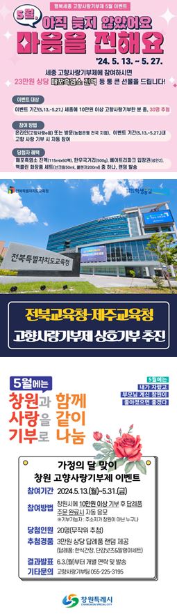2. 세종시는 13일부터 오는 27일까지 10만원 이상 고향사랑 기부자 30명을 추첨해 답례품을 추가 제공하는 '5월, 아직 늦지 않았어요. 마음을 전해요' 이벤트를 진행합니다. 추가 답례품은 매포 흑염소진액과 한우국거리, 베어트리파크 수목원 입장권, 맥클린 화장품세트 등으로 구성됐다. 이벤트는 '고향사랑e음 사이트' 또는 전국 농협에서 세종시에 기부하면 자동으로 응모된다. 당첨 결과는 다음 달 3일 시청 누리집 공지사항을 통해 발표된다.