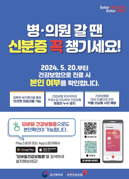 병원이나 약국에 갈 일이 있을 때 의료서비스를 싼 가격에 받을 수 있다는 것이 얼마나 좋은 혜택인지 느끼곤 합니다. 하지만 이것도 악용되는 사례가 늘자 정부에서 제재에 나섰습니다. 하여 오는 5월 20일부터 병원이나 약국에 갈 때 신분증을 반드시 지참해야 합니다. 지금까지는 이름과 주민등록번호만 말하면 진료를 받을 수 있었지만, 앞으로는 병의원 등 요양기관은 건강보험을 적용하기에 앞서 신분증 등으로 환자 본인 여부와 건강보험 자격 여부를 반드시 확인해야 합니다. 신분증 지참에 관한 내용과 원인, 예외인 경우 등을 알아보겠습니다. 그리고 매번 신분증을 지참하기 번 거로 우신 분들은 모바일 건강보험증을 다운로드하여 핸드폰에 저장해 다니시면 편하게 이용 가능하세요