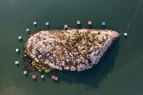 초평저수지 위에 조그맣게 형성된 섬으로 붕어섬이라고도 불리는데 봄이면 섬이 온통 벚꽃으로 뒤덮어 장관을 이룹니다. 평소 알록달록한 수상 방갈로와 낚싯배로 둘러 싸여 있지만 봄이면 또 다른 화사한 벚꽃섬을 모습을 보여줍니다. 초령저수지 주변 둘레길에 서서 벚꽃섬을 바라보는 경치는 저수지 물과 방갈로등과 멋지게 어우러집니다.