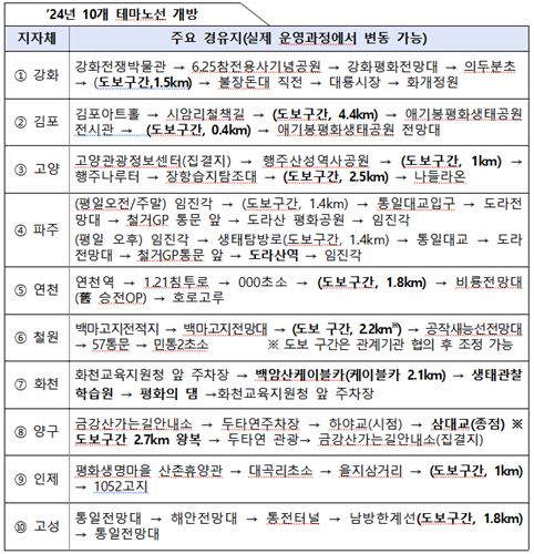 *이번 프로그램은 비무장지대 접경 지차체 별 특성을 살렸으며 인천의 강화, 경기의 김포, 고양, 파주, 연천, 강원의 철원, 화천, 양구, 인제, 고성 등 10개의 코스입니다.